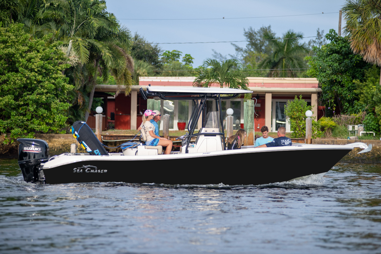 Whether you're heading offshore for fishing, exploring the coast or pulling a tube for family fun, the 2025 model year 24 HFC checks every box for on-the-water adventure. For boaters who love to raft up and swim, the 24 HFC comes standard with a portside entry door and a stern telescoping ladder for easy and safe access in and out of the water. Throughout the 24 HFC, find only the highest-quality stainless steel components, such as flush-mounted cup holders, rod holders and fold-down cleats. For fishing enthusiasts, keep more bait onboard inside the built-in 25-gallon stern baitwell, which easily doubles as dry storage when needed. Families and charter captains have plenty of room onboard the 24 HFC with the spacious U-shaped bow seating area, console front passenger seat and stern bench seat with a removable backrest. Contact your nearest Sea Chaser dealer today to see the 2025 model year 24 HFC!
